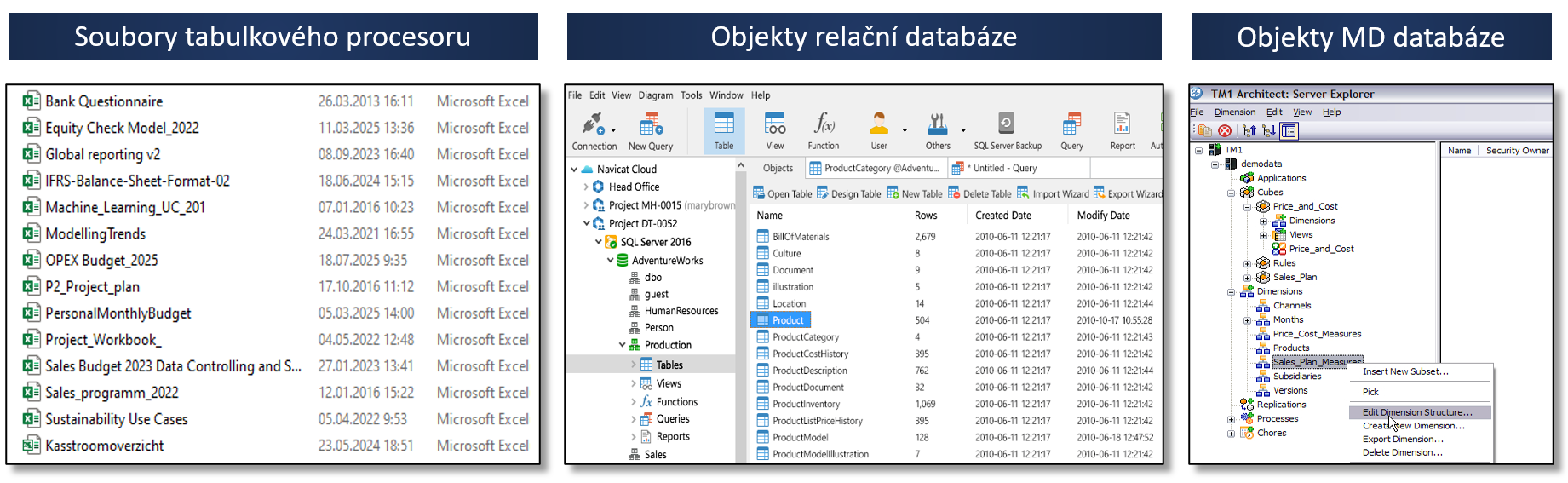 Asi nejznámějšími tabulkovými kalkulátory jsou dnes MS Excel a Libre Office Calc. Z relačních databází můžeme zmínit Oracle Database, DB2 či MS SQL Server. Patří sem i kancelářská databáze MS Access. Zástupcem multidimenzionálních databází pak jsou TM1 či Essbase.