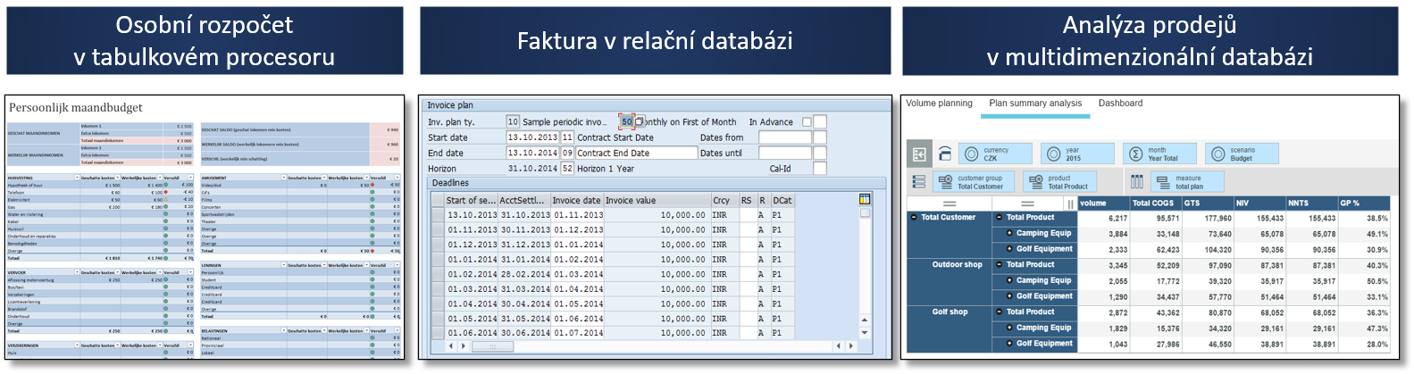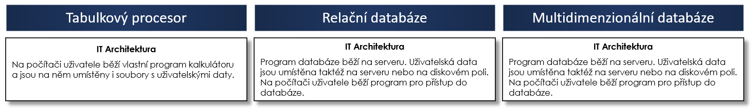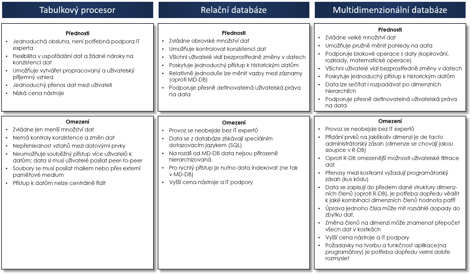 Ve finančních informačních systémech se dnes používají v zásadě tři různé technologie: tabulkový kalkulátor/procesor, relační databáze (dále R-DB) a multidimenzionální databáze (dále MD-DB). Každá z nich je světem sama pro sebe. Každá je vhodná na něco jiného a vyplatí se pohlídat si jejich správné použití při tvorbě finančních informačních systémů. Ušetří se tím spoustu nervů, práce a peněz.