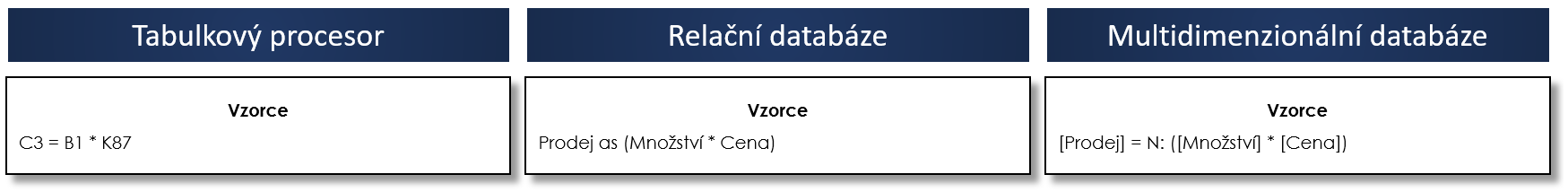 V tabulkovém procesoru vidí uživatel jen adresy buněk. Vůbec není zřejmé, co se počítá a z čeho. Databáze pracují s obecnými (věcnými) pojmy, které dávají názvy sloupcům tabulek či členům dimenzí. Ve vzorci pak uživatel vidí a může zkontrolovat, co se počítá. V tabulkovém procesoru lze vzorcem propojit jakékoliv buňky. V R-DB platí vzorec vždy jen pro určitý sloupec v tabulce a počítá se pro každý řádek zvlášť. V MD-DB platí vzorec vždy pro určitou úroveň hierarchie kombinace dimenzí.