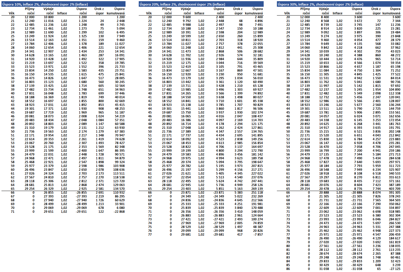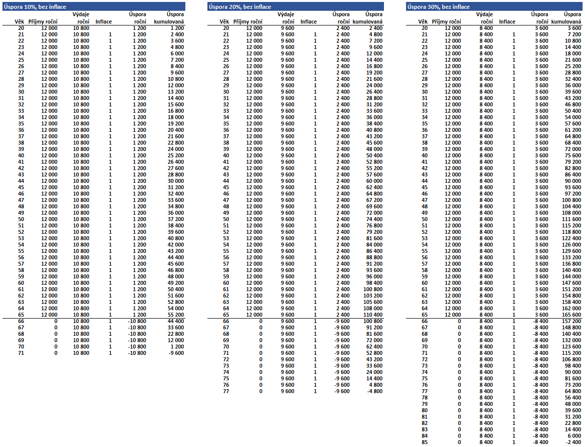 První sada čísel ukazuje, jak to vypadá, když v bezinflačním prostředí ušetříte 10%, 20% či 30% svého výdělku a do penze půjdete v 65 letech. V prvním případě vám peníze při stejných výdajích vystačí do 70 let, ve druhém do 76 let a ve třetím do 84 let.